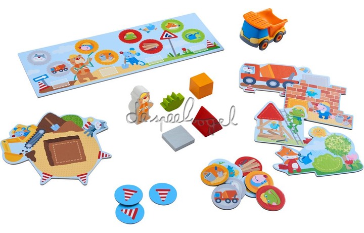 Een eerste ordenings- en memospel met grote samenwerkingsfactor in het thema van een bouwplaats en het bouwen van een huisje – incl. Rollebollen (Kullerbü) voertuig; combineerbaar met de Speelbanen