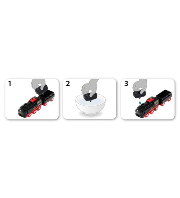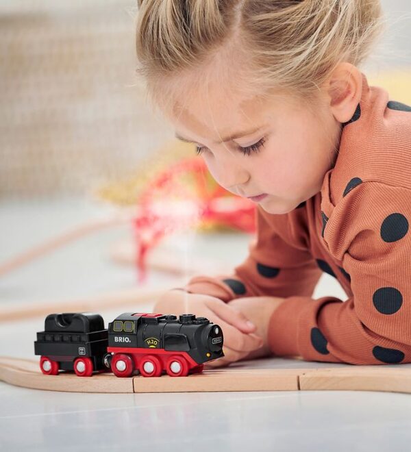 De BRIO World-trein bestaat uit 3 onderdelen en werkt op batterijen, zodat hij zelf kan rijden en de licht aan heeft. Daarnaast kun je water bijvullen met behulp van een klein, bijgeleverd pompje, waarmee de trein stoom kan opwekken als een echte stoomtrein.