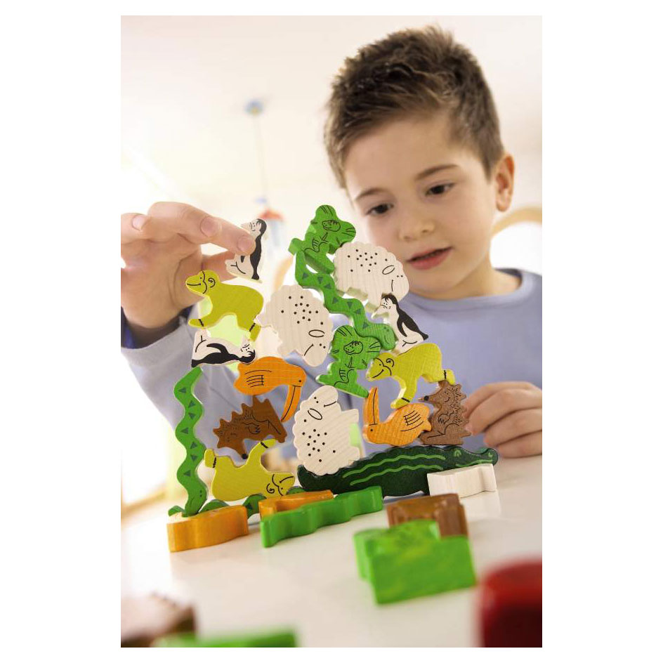 Stapel de dieren voorzichtig op elkaar en vorm een piramide. Krijg jij de krokodil op de pinguïn? Maar pas op want 1 verkeerde beweging en de dieren piramide valt uit elkaar! Het spel komt met 29 verschillende houten dieren en de spelregels.