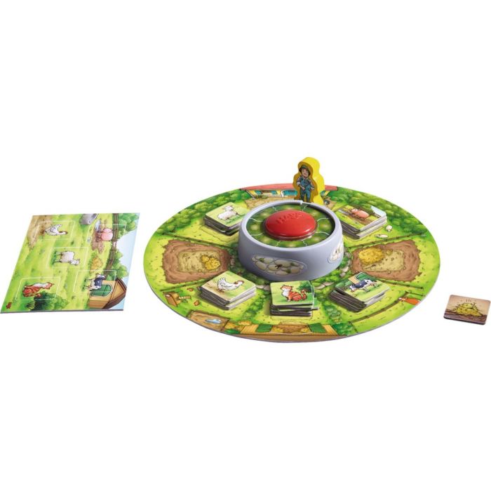 Elke morgen moet boer Bruno zijn dieren naar de weide brengen. Maar waar hebben de lammetjes, koeien, kippen, varkens en katten zich verstopt? Wie op de drukknop met dierengeluiden drukt, de oren spitst en herkent welk dier zich laat horen, kan het snel vinden en naar de weide brengen. Inhoud: 1 spelbord, 1 drukknop met dierengeluiden, 1 boer, 4 weidekaarten, 25 dierkaartjes, 1 mesthoopkaartje, 1 handleiding.