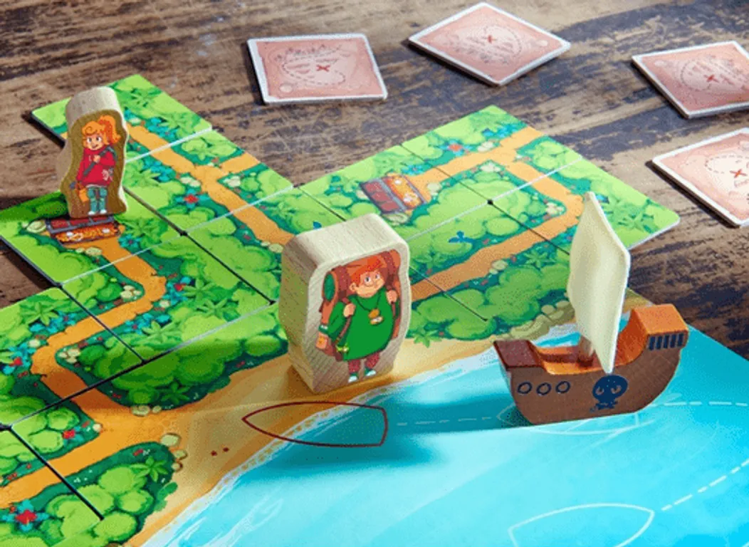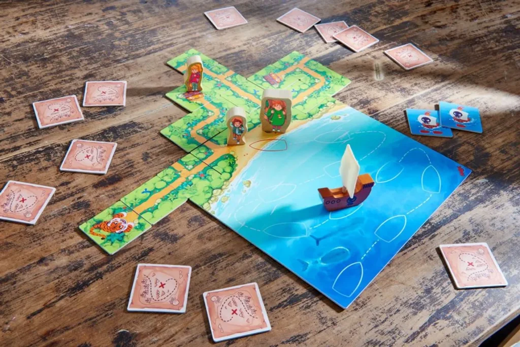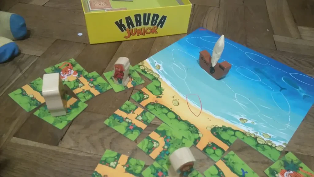 Karuba Junior is een coöperatief avonturenspel met tegelplaatsing, waarin spelers samen met drie dappere avonturiers op zoek gaan naar schatten in de jungle op het eiland Karuba. Lukt het jullie om de padtegels zo te plaatsen dat jullie alle schatten bereiken voordat de gemene piraten het eiland plunderen? Jullie moeten samenwerken en oppassen voor tijgers die de paden blokkeren. Met een beetje vaardigheid en geluk zijn jullie sneller dan de piraten!