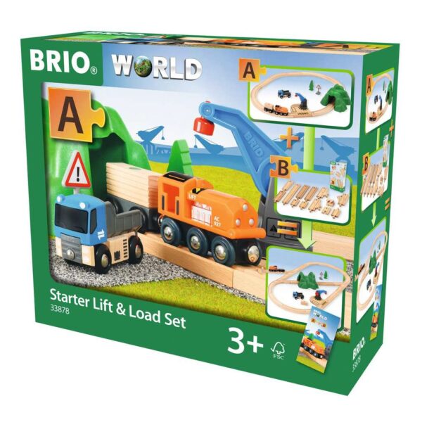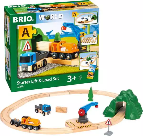 Iedereen instappen! Bouw je eerste BRIO treinwereld met deze nieuwe lift & load starterset A. Er zit heel wat in: een kraan, truck, locomotief, wagon met lading en zelfs een waarschuwingsbord, boom, en een kleine berg met tunnel om doorheen te rijden! Los de lading van de truck met de kraan, laat de kraan draaien en zet de lading op de trein. Sluit aan bij alle producten van BRIO World. BRIO World is een speelsysteem dat meegroeit met de fantasie van kinderen. Er bestaat geen goed of fout, en wat gisteren is gebouwd kan vandaag snel worden verbouwd voor het volgende avontuur. In deze speelwereld met open eind worden kinderen uitgedaagd in hand- oog coördinatie, planning en creativiteit. Laat kinderen zichzelf en hun omgeving op een veilige manier ontdekken, en maak fantastische jeugdherinneringen!