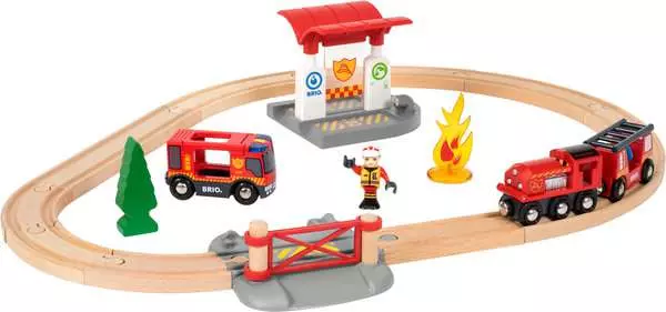 Er is brand en ze hebben jouw hulp nodig! Deze 18-delige brandweerset van hout zit vol met brandbestrijdingsrollenspelactie. Spring aan boord van de brandweerwagen met op batterijen werkende sirene en lichten om snel ter plaatse te zijn. Gebruik vervolgens de krachtige waterslang aan de achterkant van de brandweertrein om de brand te blussen en de dag te redden.