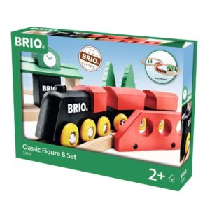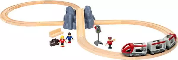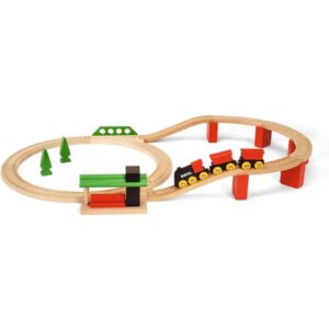 De Railway Starter Set is alles wat je nodig hebt om je eerste treinset te maken en de BRIO World te betreden. De 26-delige treinset heeft een klassieke 8-vormige spoorindeling met een bergtunnel en een brugkruising. Plaats de machinist vooraan in de trein en begin de reis rond de houten rails. Rijd over de berg, door de tunnel en stop dan bij het lichtsignaal om de passagiers op te halen. Help ze instappen in de trein en laat de reis dan doorgaan.