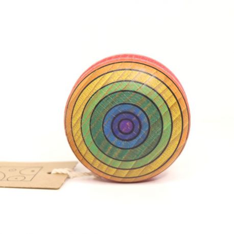 Een mooie, handgemaakte houten regenboog jojo. Deze kleurrijke jojo met karakteristieke zwarte lijnen heeft een diameter van 6 cm. Hij is gemaakt van beukenhout en geschikt voor kinderen vanaf 3 jaar.